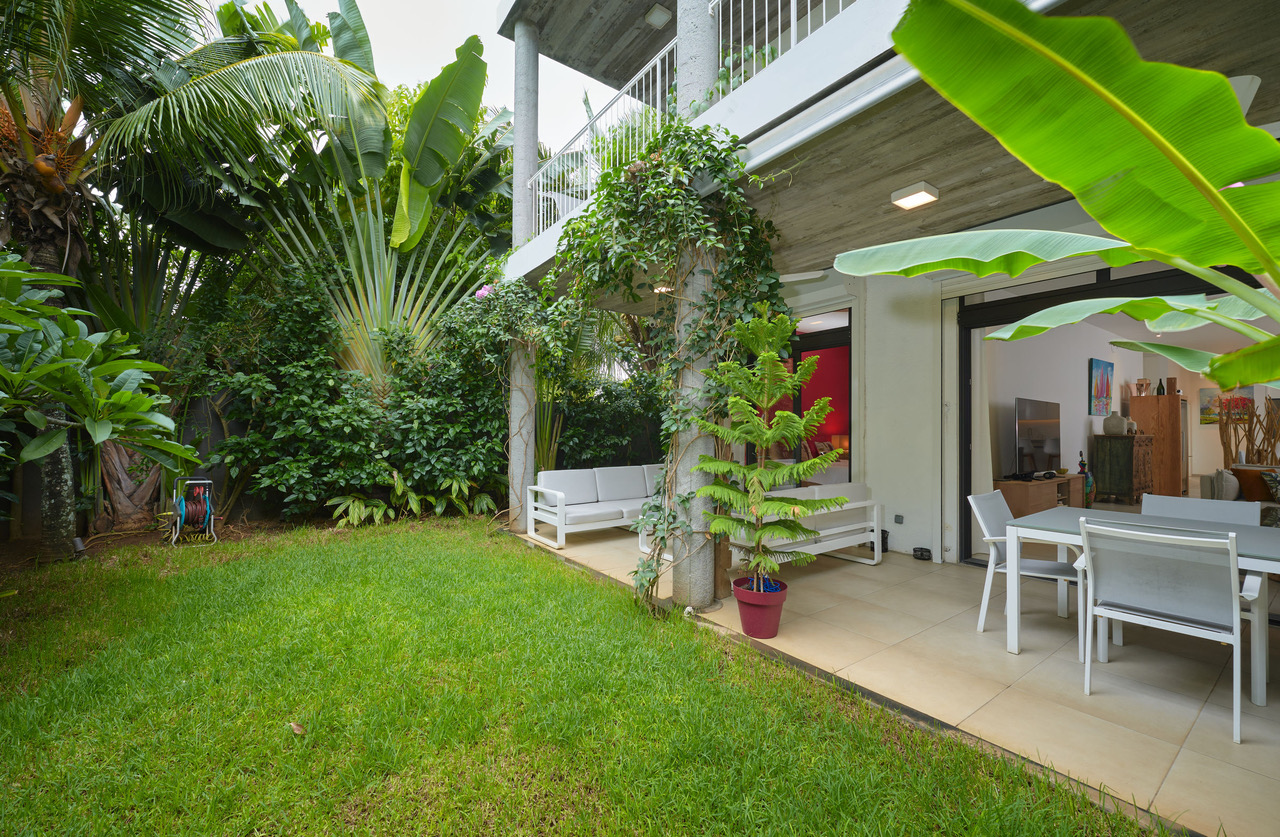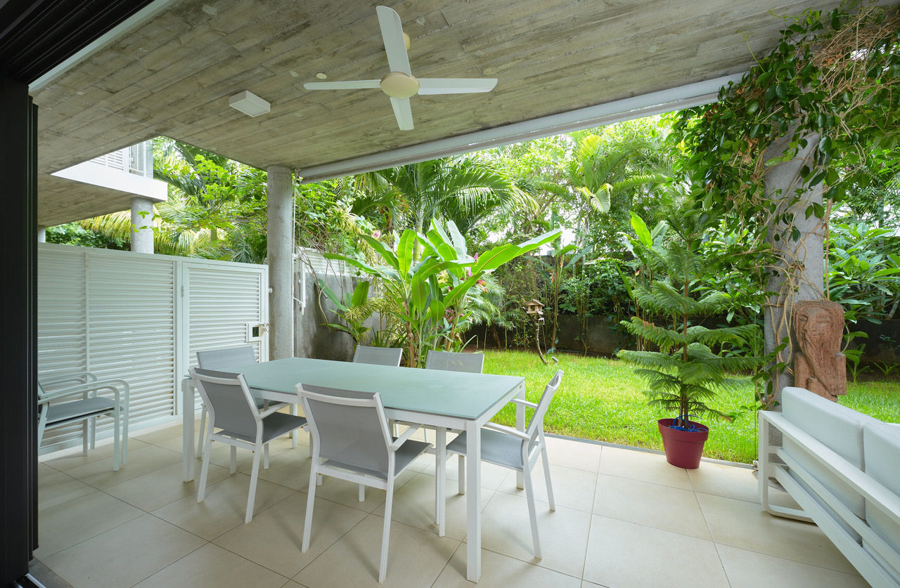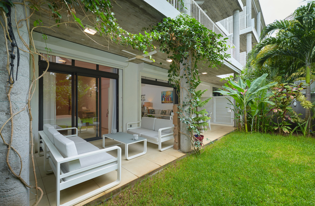 Superbe appartement en rez de jardin, idéalement situé route côtière à Pointe aux Canonniers, au sein d’une agréable résidence avec piscine commune, à 2 pas de la mer.