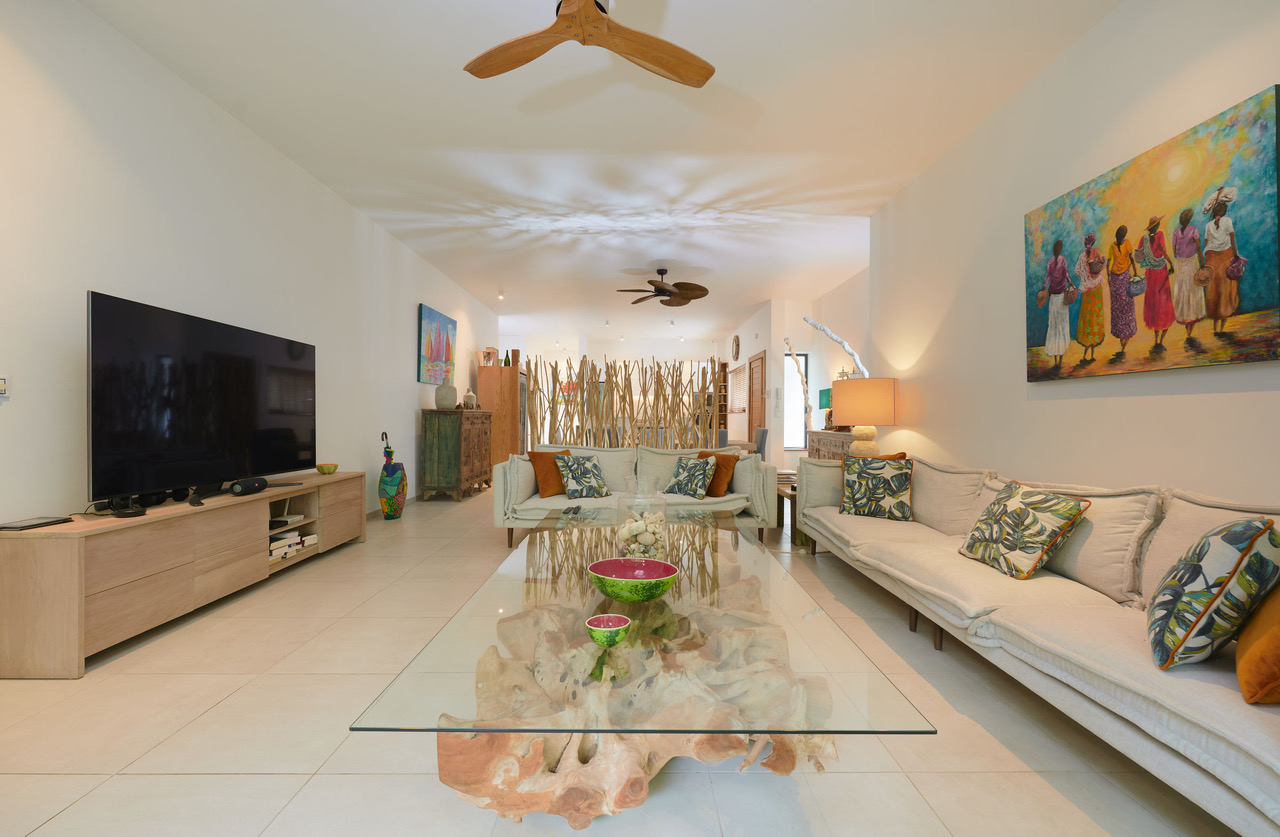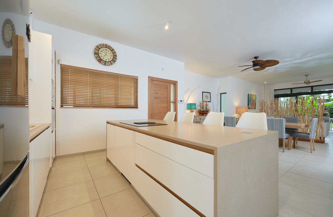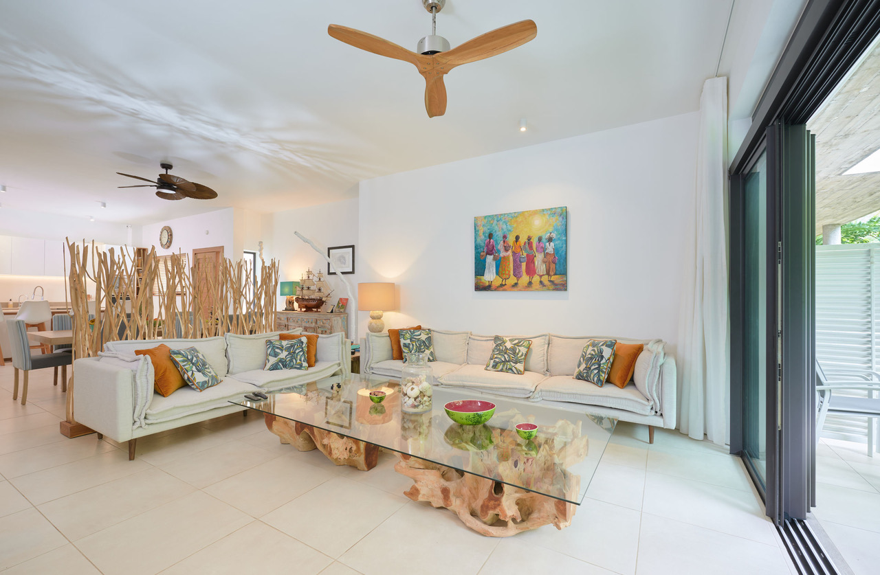 Superbe appartement en rez de jardin, idéalement situé route côtière à Pointe aux Canonniers, au sein d’une agréable résidence avec piscine commune, à 2 pas de la mer.