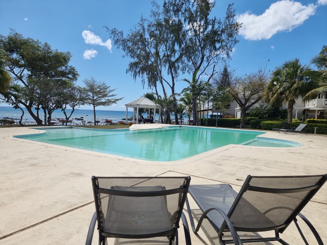 Côté extérieur : grande piscine commune, kiosque, superbe plage de sable.